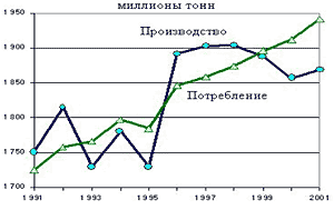 График 1. Производство и потребление зерна в мире за последние 10 лет (по данным FAO).