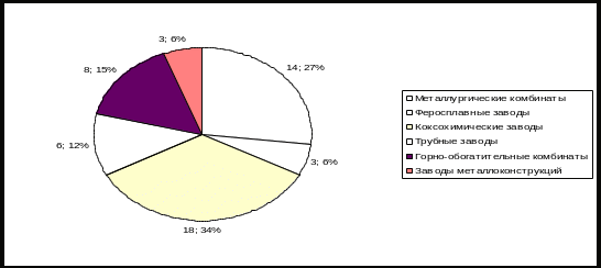 Метулларгический комплекс Украины включает более 400 предприятий, причем значительную часть составляет черная металлургия, в составе которых 14 металлургических комбинатов и заводов, 3 ферросплавных, 18 коксохимических, 6 трубных заводов, 8 горно-обогатительных комбинатов (ГОКов) и 3 завода металлоконструкций. Структура черной металлургии Украины приведена на рис. 2.1.