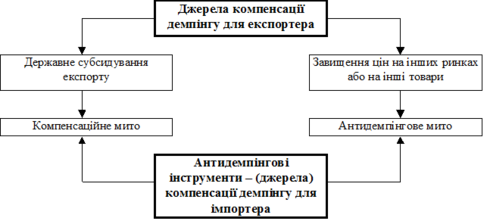 Демпінг може здійснюватися компанією як за рахунок власних ресурсів, так і за рахунок експортних субсидій. У випадках доведення факту демпінгу, шкоди від нього та джерела компенсації збитків експортера, застосовуються антидемпінгові та компенсаційні мита, які вже стають джерелом компенсації збитків імпортера (Рис.2).