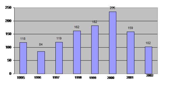Аналіз динаміки загальної кількості антидемпінгових заходів, застосованих країнами-членами СОТ за 1995-2002 рр. показує, що починаючи з 1996 року кількість вжиття таких заходів стрімко збільшувалась і досягла свого максимуму за даний період в 2000 р. – 235 заходів. Зі зменшенням ділової активності та появою ознак кризового стану світової економіки кількість застосованих заходів зменшилась, хоча вже за 6 місяців 2002 р. був перекритий рівень 1996 року (Рис.3).