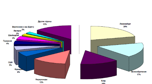 Вывод о том, что значительная доля привлеченного из-за рубежа капитала в форме ссуд и займов имеет российское происхождение, косвенно подтверждается и страновым распределением ввозимого в Россию капитала. Большая его часть осуществляется либо через страны с облегченным налоговым режимом и страны - политические убежища (Нидерланды, Великобритания, Люксембург), либо через оффшорные зоны (Кипр, Виргинские острова) - см. рис.6.