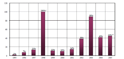 Рис.8. Динамика соотношения выплаченных нерезидентам доходов к сальдированному финансовому результату в промышленности в 1995-2005 гг.