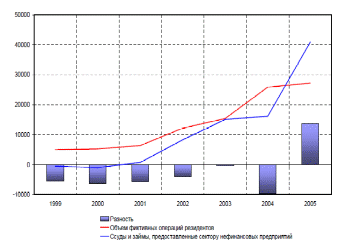 Дополнительным доводом в пользу отечественного происхождения определенной части ввозимого в Россию капитала является сопоставление его притока с динамикой утечки капитала. Как видно из рис.7, отмечается достаточно четкая зависимость между утечкой российского капитала и притоком капитала нерезидентов в форме ссуд и займов. Превышение размера утечки над объемом предоставленных ссуд и займов в 2004 г. (обусловленное повышением рисков вложений в российскую экономику в связи с делом ЮКОСа) было компенсировано более объемными, по сравнению с утечкой, вложениями нерезидентов в следующем, 2005 году.