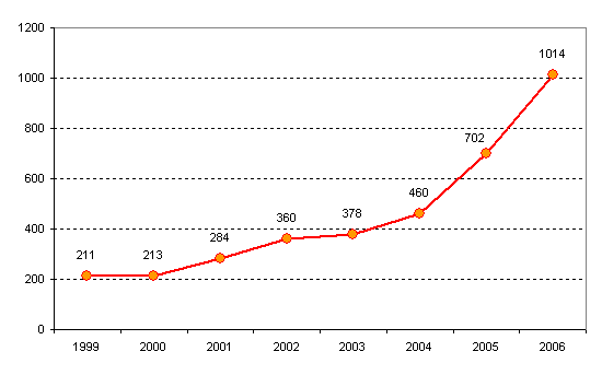 Число официально работающих в России трудовых мигрантов постоянно увеличивается. В 2006 году оно превысило 1 млн. человек, причем эти люди представляют более чем 40 стран мира (рис. 1). По-прежнему этот показатель отражает лишь небольшую часть реального процесса: согласно экспертным оценкам, численность нелегальных (или незаконно занятых) трудовых мигрантов в России составляет сегодня от 4 до 6 млн. человек и как минимум в пять раз превышает данные официальной статистики. Однако если в начале 2000-х годов численность официально привлекаемой из-за рубежа иностранной рабочей силы не превышала нескольких сотен тысяч человек и составляла не более 5% всех трудовых мигрантов, то во второй половине десятилетия под влиянием произошедшей либерализации миграционной политики наметилась явная тенденция к увеличению легальной составляющей миграции.