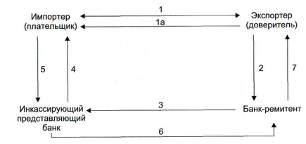 Экспортер заключает контракт с импортером о продаже товаров на условиях расчетов по документарному инкассо и отправляет ему товар (1а).