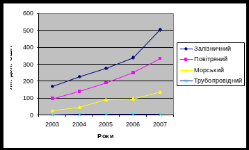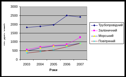 З даного рис. 2.6 видно, що протягом досліджуваного періоду обсяги експорту за усіма видами транспортних послуг помітно збільшуються. Найбільшу частку в експорті транспортних послуг становлять послуги трубопровідного транспорту, а найменшу – повітряного. Варто звернути увагу на зростання обсягів експорту послуг трубопровідного транспорту, адже, якщо спостерігається зростання у 2003-2006 роках (причому досить стрімке у 2006), то у 2007 році відбувається спад.