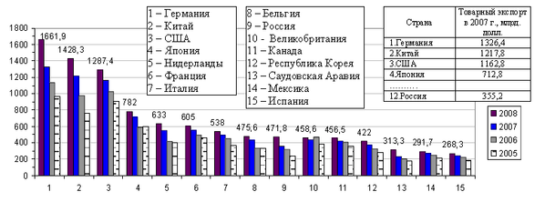 Рисунок 1 – Крупнейшие страны-экспортеры и объем их товарного экспорта в 2005-2008 годах, млрд. долл. США