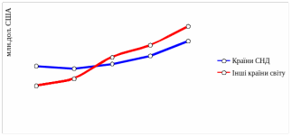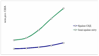 Обсяги імпорту за п’ять років також звеличилися (додатки 1 – 5 та рис. 3.4). Маємо по СНД ріст із 295,6 млн.дол. США у 2002 році до 702,3 млн.дол.США, тобто темп росту 237,6%. По іншим країнам рост із 896,0 млн.дол. у 2002 році до 3110,1 млн.дол. у 2006 році, тобто темп росту 347,1%. (данні на основі даних додатку 1 [34])