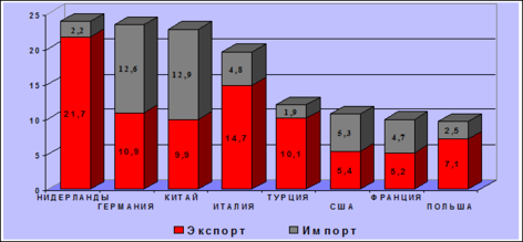 Лидирующие позиции среди стран-членов Евросоюза занимали Германия, Нидерланды и Италия, на долю которых приходилось 47,9% внешнеторгового оборота с данной группой стран.