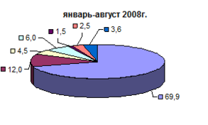Стоимостный объем экспорта продовольственных товаров и сельскохозяйственного сырья (кроме текстильного) вырос в 1,3 раза в результате увеличения физических объемов поставок зерна, несмотря на снижение средних контрактных цен. Доля продовольственных товаров в структуре экспорте увеличилась с 1,5% в январе-августе 2008 г. до 3,6% в январе-августе текущего года.