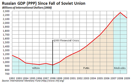 По итогам первого квартала 2010 года, по темпам роста ВВП (2,9 %) и роста промышленного производства (5,8 %) Россия вышла на 2-е место среди стран «Большой восьмёрки», уступив только Японии.