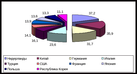 Основными торговыми партнерами России в январе-августе 2010 года среди стран дальнего зарубежья были: Нидерланды, товарооборот с которыми составил 37,2 млрд.долларов США (155,1% к январю-августу 2009 года), Китай – 35,9 млрд.долл.США (157,1%), Германия – 31,7 млрд.долл.США (134,7%), Италия – 23,6 млрд.долл.США (120,7%), Турция – 16,1 млрд.долл.США (134,5%), США – 14,1 млрд.долл.США (133,4%), Франция – 13,9 млрд.долл.США (140,6%), Япония – 13,6 млрд.долл.США (153,4%), Польша – 13,3 млрд.долл.США (138,4%), Республика Корея – 11,1 млрд.долл.США (182,2%).
