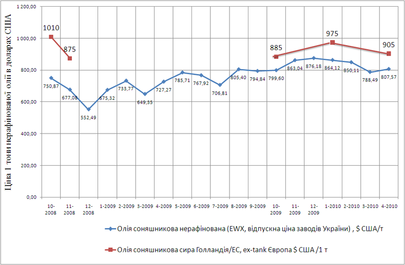 Рис.1.4 Динаміка цін на олію соняшникову нерафіновану на внутрішньому ринку України та на зовнішніх світових ринках (в доларах США за 1 тону) у 2008 -2010 рр.