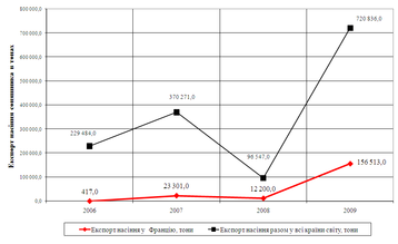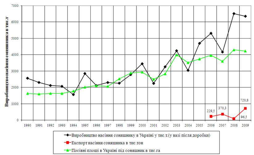 Під впливом сприятливої кон'юнктури світового ринку за попередніми даними у 2008/2009 МР експорт насіння соняшника пожвавився і склав 767 тис. тонн, що у 10 разів більше проти 2007/2008 МР [47].