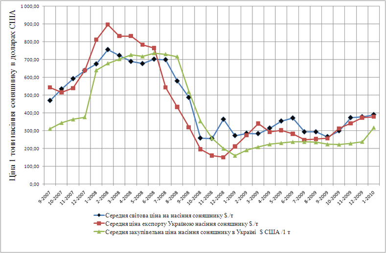 Рис.1.6. Порівняння світових та внутрішніх цін України на насіння соняшнику у 2007 - 2010 рр.