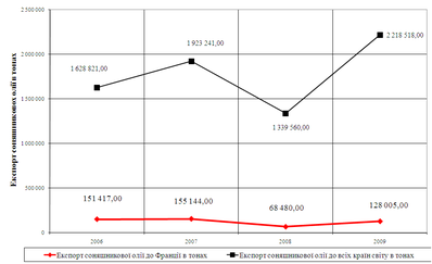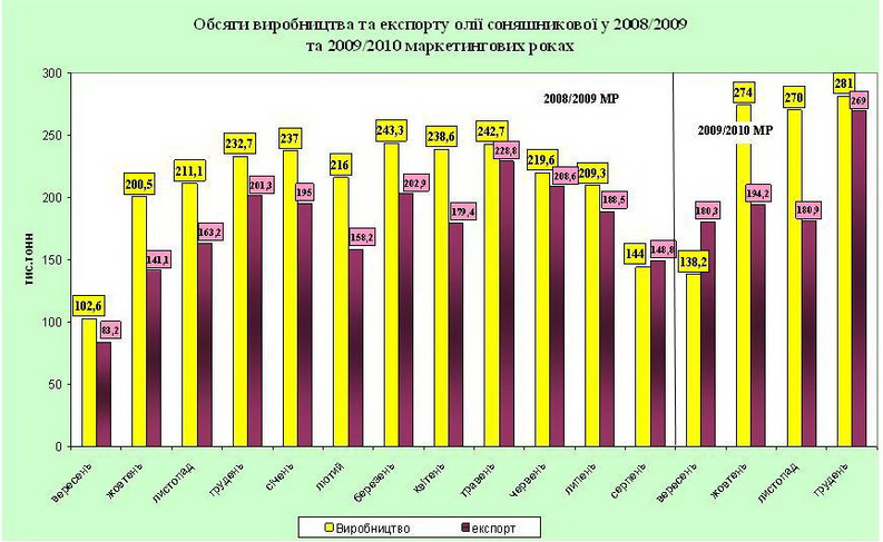 Україна посідає провідне місце на світовому ринку з продажу олії соняшникової. При цьому 90% від загального експорту складає олія неочищена. За попередніми даними у 2008/2009 МР експортовано 2099 тис. тонн олії соняшникової, що на 57% більше проти відповідного періоду минулого року.