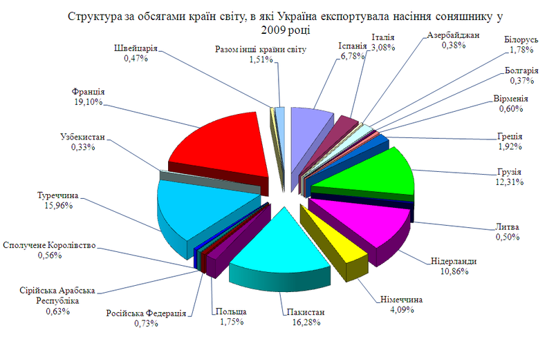 Рис.1.11. Структура експорту насіння соняшнику Україною та частка Франції в експорті у 2009 році