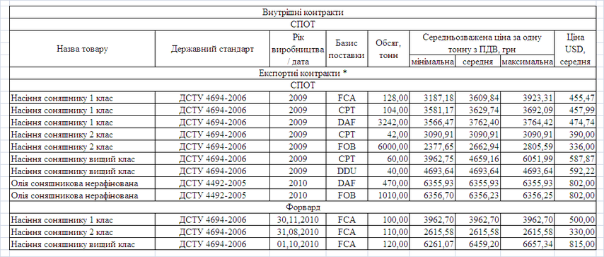 При розробці контракту на поставку насіння соняшнику враховані результати аналізу оперативної інформації про ринкові середні ціни на насіння соняшнику та олію соняшникову нерафіновану (табл. 1.6 -1.8) [47].