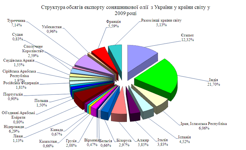 Найбільшими імпортерами нерафінованої олії у 2008/09 МР стала Індія – 25% від обсягів загального експорту з України, Туреччина – 13%, Єгипет – 8,3%. Серед країн ЄС: Франція – 5,7%, Італія – 5,2%, Нідерланди – 4,6%, Іспанія – 4,5% від обсягів загального експорту з України [43].