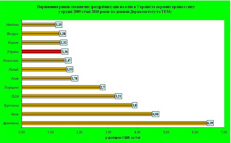 Рис.1.5. Порівняння роздрібних цін в доларах США на 1 л соняшникової олії в Україні та інших країнах світу [46]