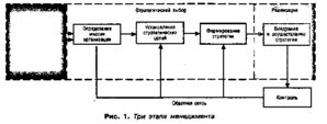 Такой подход соответствует трём этапам менеджмента: стратегический анализ — стратегический выбор — реализация (рис. 1)