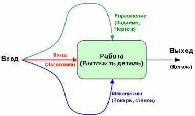 Давайте рассмотрим пример бизнес-процесса "Выточить деталь", который выполняет токарь. Входом процесса является заготовка из которой вытачивается деталь – она физически преобразуется в процессе. Для того, что бы токарь начал точить деталь ему нужно дать задание или план. Также ему понадобится чертеж с размерами детали. Так вот, чертеж, задание или план нужны для реализации бизнес-процесса и процесс без них не начнется, но по ходу выполнения процесса они не преобразуются. Согласно стандарту IDEF0 их относят к управлению. Для того, что бы выточить деталь нужен токарь, нужен станок – их относят к механизмам. Выходами или результатами бизнес-процесса является деталь (рис. 3).