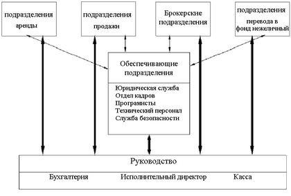 Риэлторские компании имеют максимально простую организационную структуру в форме головного офиса и дополнительных региональных офисов, что не несет организационные факторы риска и несущественно влияет на деятельность компаний. Для риэлторских компаний более значимым являются отраслевые факторы риска и операционные риски. В состав Инком-недвижимости входят 31 офис в Москве и региональные представительства в Красноярске, Алма-Ате, Кирове. Управление и структура агентства недвижимости(рис 38).