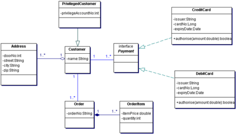 На диаграмме классов, приведенной ниже, статическая структура описана вокруг главной сущности - Customer (покупатель), который связан с набором других классов, например Address (адрес), Order (заказ), и интерфейсом Payment (платеж). У покупателя может быть несколько Addresses (адресов) смоделированных агрегированием. Также у покупателя может быть отношение ассоциации с интерфейсом Payment (платеж) и классом Order (заказ). Интерфейс Payment (платеж) может быть либо CreditCard (кредитной картой) либо DebitCard (дебетовой картой), которые являются двумя реализационными моделями интерфейса Payment (платеж). У каждого заказа может быть много присоединенных OrderItems (предметов заказа). Так как OrderItem (предмет заказа) не может существовать без Order (заказ), то отношение смоделировано как композиция. PrivilegedCustomer (привилегированный покупатель) это особый Customer (покупатель), у которого есть скидки на сделанные покупки, и который является продолжением Customer (покупатель) на основе отношения обобщения. Навигация указывает направление перемещения по ассоциации. Кратность описывает возможные сущности. .