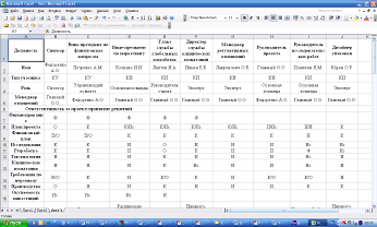 Ответственность за проект/принятие решений: Ф - финансирует проект; О – одобряет или накладывает вето; К – консультант (необходимо получить от него информацию); П – подготовка (ответственность за инициацию работ); Ис - исполнитель (отвечает за выполнение конкретной работы ) И – информация (не принимает решения, только получает необходимую информацию).