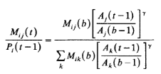 где k включает весь набор регионов, Мij относится к людям, которые остаются в регионе i ("стайеры"), A относится к индексу привлекательности региона, и y - параметр, измеряющий величину миграции в ответ на изменяющуюся привлекательность региона.