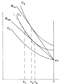 Yn - доход неработающего потребителя и набор кривых Ui изображают предпочтения потребителя между досугом и доходом. Для решения участия в рабочей силе (Рисунок 1), критический параметр - абсолютная величина наклона линии wr, касательной к кривой безразличия в точке, где часы работы равны нулю и доходом, не связанным с работой - Yn. Этот наклон - минимальная заработная плата потребителя (или теневая заработная плата в нулевые часы работы), зависящая как от Yn, так и от предпочтений потребителя между доходом и временем, доступным для отдыха. Набор потребительских выборов между доходом и досугом, показывается линией, идущей из точки (T, Yn) с абсолютным наклоном wm, где wm является рыночной заработной платой. Для wm wr (Wm2 на рисунке 1), участие происходит с уровнем затрачиваемых на работу часов, отличным от нуля (T-h0 для wm2 на рисунке 1).