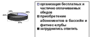 На вопрос анкеты, какие дополнительные услуги со стороны предприятия вам необходимы, многие хотели бы, чтобы со стороны предприятия уделялось внимание спортивно-оздоровительным мероприятиям (покупка абонементов в бассейн, в фитнес-клубы и т.д.), организовывались бесплатные или частично оплачиваемые обеды.