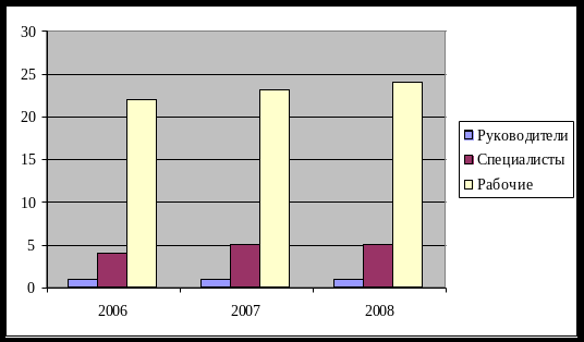 В целом по такому небольшому предприятию наблюдается положительная динамика кадров. Так, на протяжении 2006-2008 гг. общее количество работников увеличилось на 3-х человек (рис. 1).