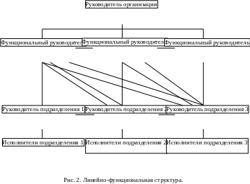 Практика использования линейных структур подсказала некоторые пути преодоления их недостатков, в частности соединение централизованной линейной структуры и высокоспециализированной функциональной структуры. Сущность линейно-функциональной структуры состоит в том, что в организационную структуру включаются отдельные структурные единицы: (подразделения), выполняющие узкоспециализированные функции на высоком профессиональном уровне. Влияние деятельности этих структурных единиц распространяется на отдельные стороны линейной структуры таким образом: в какой-то момент деятельности линейный руководитель передает свои права управления представителям функциональной структуры, но следит за тем, чтобы прерогативы функционального руководителя не выходили за рамки его компетенции. Например, для усовершенствования производственного процесса требуется вмешательство конструкторов, начальник соответствующего участка на производстве содействует работе конструкторов, но в целом не вмешивается в детали их деятельности. Как только конструкторы завершают свою работу, начальник участка полностью возвращает себе прерогативы власти и руководит всем производственным процессом на участке, включая реализацию рекомендаций конструкторов. Линейно-функциональная структура представлена на рис. 2.