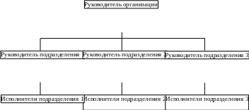Здесь вертикальные линии обозначают организационные коммуникации, построенные по принципу руководитель — подчиненный (или наоборот — в случае обратной связи). Горизонтальные линии обозначают деловые связи между руководителями одного уровня, между коллегами (линейная структура не предусматривает горизонтальных коммуникационных связей). Этот вид структуры имеет иерархическую цепочку, расширяющуюся вниз по вертикали. Другими словами, у каждого руководителя находится в подчинении несколько (более одного) членов организации.