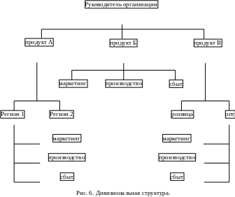 В крупных диверсифицированных компаниях также появляются дивизиональные структуры смешанного типа, сочетающие как продуктовый, так и территориальный принципы построения (рис. 6).