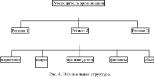 С точки зрения местных факторов использование территориальной организационной структуры приобретает некоторые дополнительные плюсы. Это вызывает создание новых рабочих мест для местного населения, не говоря уже об экономической выгоде, а именно снижении транспортных расходов, ренты, стоимости рабочей силы. Преимущества территориальной организации сбытовой деятельности заключаются в основном в экономии средств и высокой эффективности работы. Сбытовой персонал может уделять больше времени продаже товаров и сократить затраты на передвижение. Кроме того, будучи ближе к покупателям, он получает возможность изучить их потребности, рыночные предпочтения и выяснить, какая рыночная стратегия будет иметь наибольшие шансы на успех. Схематично региональная организационная структура представлена на рис. 4.