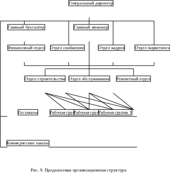 Из приведённой схемы видно несовершенство действующей ОСУ. Данная структура может быть отнесена к линейным, практически в чистом виде, со всеми присущими ей недостатками. Отсутствие в организации горизонтальных связей свидетельствует об усложнении решения любого возникающего вопроса, т.к. он может быть решён только через непосредственного руководителя. Также можно увидеть и концентрацию полномочий в руках всего трёх руководителей: генерального директора, главного инженера, главного бухгалтера. Это несомненно ведёт к чрезмерной перегрузке последних.
