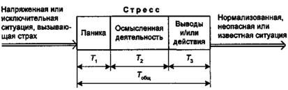 Паника — составляющая стресса человека. Стресс определяется как состояние или процесс повышенного нервного напряжения из-за наличия напряженных или исключительных ситуаций, вызывающих страх. Общие положения теории стресса были сформулированы канадским патологом Г. Селье в 1963 г. Стресс включает три основные части: собственно панику, осмысленную деятельность и разработку выводов или действии. Общая схема стресса показана на рис. 6 (T1 — время состояния паники, T2 — время осмысленной деятельности, T3 — время, потраченное на формирование выводов по ситуации или предпринятое конкретных действий).