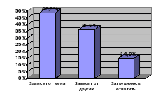Следующий вопрос анкеты касался зависимости происходящих инновационных событий от конкретных людей. На данный вопрос предлагалось выбрать один из трех вариантов ответов: «нововведения в компании зависят от меня»; «зависят от других»; «затрудняюсь ответить».