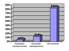Как свидетельствуют данные, представленные на рис. 3.4., преобладающее большинство респондентов (46,0%) считают, что причина инновационной деятельности предприятий заключается в изменениях, происходящих в нашей стране. Переход к рыночной экономике во главу угла поставил вопрос о выживании предприятий в новых непростых условиях хозяйствования – условиях рынка, которые, в свою очередь, предполагают наличие конкурентной борьбы. Поэтому мнение респондентов относительно того, что основная причина инновационной деятельности предприятий заключается в изменениях в отечественной экономике, вполне понятна и оправдана. Иного мнения придерживаются 14,8% респондентов, видящих основную причину внедрения инноваций в желании руководства, которое может быть обусловлено потребностью в увеличении прибыльности и рентабельности предприятия, расширении доли рынка и т.д. Оставшиеся 30,4% опрошенных считают, что главная причина инновационной политики заключается в необходимости развивать компанию. Следовательно, большинство сотрудников объективно воспринимают инновационный процесс, понимая необходимость для компании идти в ногу со временем. Небольшой процент сотрудников, приписывающих введение инноваций личным потребностям руководства, вероятно, негативно относятся к нововведениям. Тот факт, что процент таких людей достаточно низок, говорит о проводимой работе по управлению нововведениями (информирование; формирование убежденности людей в том, что процесс внедрения инноваций зависит во многом от них; материальная заинтересованность сотрудников в инновации и др.).