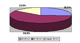 Таким образом, преобладающее большинство респондентов относится к средней возрастной группе (59,5%). Их возраст находится в пределах 30-40 лет. Ровно ¼ работников ООО «Техносеть» составляют работники молодого возраста (от 20 до 30 лет). И, наконец, 15,0% респондентов находится в возрасте старше 40 лет. Отсюда можно сделать вывод, что руководство предприятия делает ставку на молодых сотрудников и на тех, чей возраст не пересек границу 40 лет.