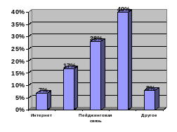 Данные рис. 3.8. свидетельствуют, что в повседневной жизни респонденты (40%) отдают наибольшее предпочтение компьютерным технологиям, как средству не только работы, но и развлечений. Пейджинговую связь, в свою очередь, предпочитают 28% опрошенных. В то же время только 17% респондентов пользуются услугами сотовой связи. На наш взгляд, сотовая связь является более удобной в обращении, однако, мы осознаем, что ее услуги обходятся значительно дороже, чем, например, пейджинговые. Пользователями интернета являются лишь 7% опрошенных, тогда как компьютер есть у 40% респондентов. Причин «непопулярности» интернета среди опрошенных может быть несколько: