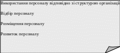 Виходячи з цього, під управління персоналом, за звичай, розуміють всю сукупність організаційних заходів, що спрямовані на оптимальне формування колективу і повне використання здібностей у виробничому процесі ( політика підбору і найму працівників, розвиток кар’єри, мотивація, заохочення, звільнення з роботи, вихід на пенсію, лідерство в колективі, культура, взаємовідносини і зв’язки, розвиток колективу, творча обстановка, підготовка персоналу, управління конфліктною ситуацією ), оскільки для досягнення успіху на ринку організація повинна мати стабільний персонал.