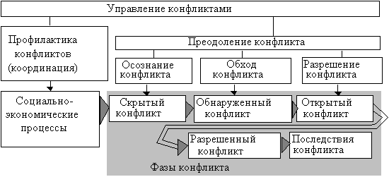 В каждой организации происходят различные конфликты, высококвалифицированный менеджер должен стараться их избегать, но еще одним видом социологических методов является управление конфликтами. Под конфликтом понимают « столкновение мнений несогласных сторон». Управление конфликтами можно изобразить в виде схемы: