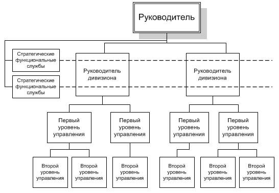Дивизиональная структура может применяться и внутри производственных объединений. Здесь в качестве отделений обособляются не только продуктовые производственные звенья , но и получающие относительную самостоятельность обслуживающие подразделения—транспортные, ремонтные, заготовительные, сбытовые, проектные. Они наделяются ответственностью за достижение поставленных целей и правами распорядительства ресурсами, могут вступать в хозяйственные отношения как с другими отделениями, так и с внешними организациями, становятся самостоятельными хозрасчетными единицами, что является главным признаком их превращения в отделения. Важным свойством дивизиональных структур является формирование внутри каждого отделения собственного функционального аппарата управления, находящегося в более или менее тесном взаимодействии с центральным штабным и функциональным аппаратами.