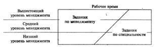 Такое распределение общего времени связано с тем, что менеджеры всех трех уровней имеют два вида заданий: задания по менеджменту и задания по специальности (рис. 7). Это значит, что руководитель любого уровня управления определенный процент времени тратит на принятие управленческих решений и определенный — на принятие решений по специальности. Как видно из рисунка 7, с повышением уровня управления удельный вес заданий по специальности падает, а по менеджменту, соответственно, возрастает.