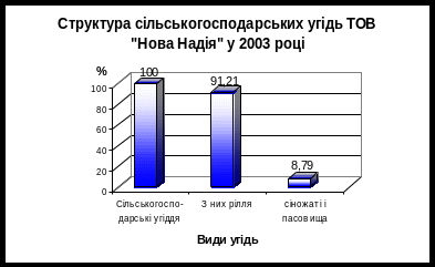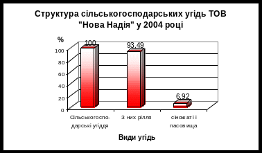 Висновок: Виконавши розрахунки можна зробити висновок, що найбільшу питому вагу в структурі сільськогосподарських угідь як 2003 так і в 2004 році в ТОВ «Нова Надія» займає рілля, відповідно – 91,21% (Діаграма 1) та 93,49% (Діаграма 2). Найменшу питому вагу займають сіножаті та пасовища, відповідно – 8,79% та 6,92%. Отже, у 2004 році дане товариство збільшило площу сільськогосподарських угідь, за рахунок цього була збільшена і рілля.
