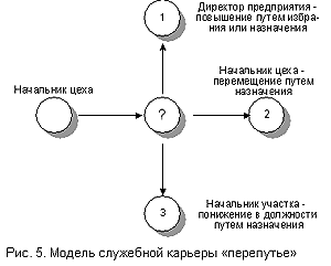 одель карьеры "перепутье" предполагает по истечении определенного фиксированного или переменного срока работы прохождение руководителем или специалистом комплексной оценки (аттестации), по результатам которой принимается решение о повышении, перемещении или понижении в должности. По своей философии это американская модель карьеры, ориентированная на индивидуализм человека.