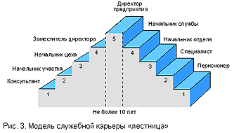 Модель карьеры "лестница" предусматривает, что каждая ступенька служебной карьеры представляет собой определенную должность, которую работник занимает фиксированное время, например, не более 5 лет. Такого срока достаточно для того, чтобы войти в новую должность и проработать с полной отдачей. С ростом квалификации, творческого потенциала и производственного опыта руководитель или специалист поднимается по служебной лестнице (рис. 3). Каждую новую должность работник занимает после повышения квалификации.
